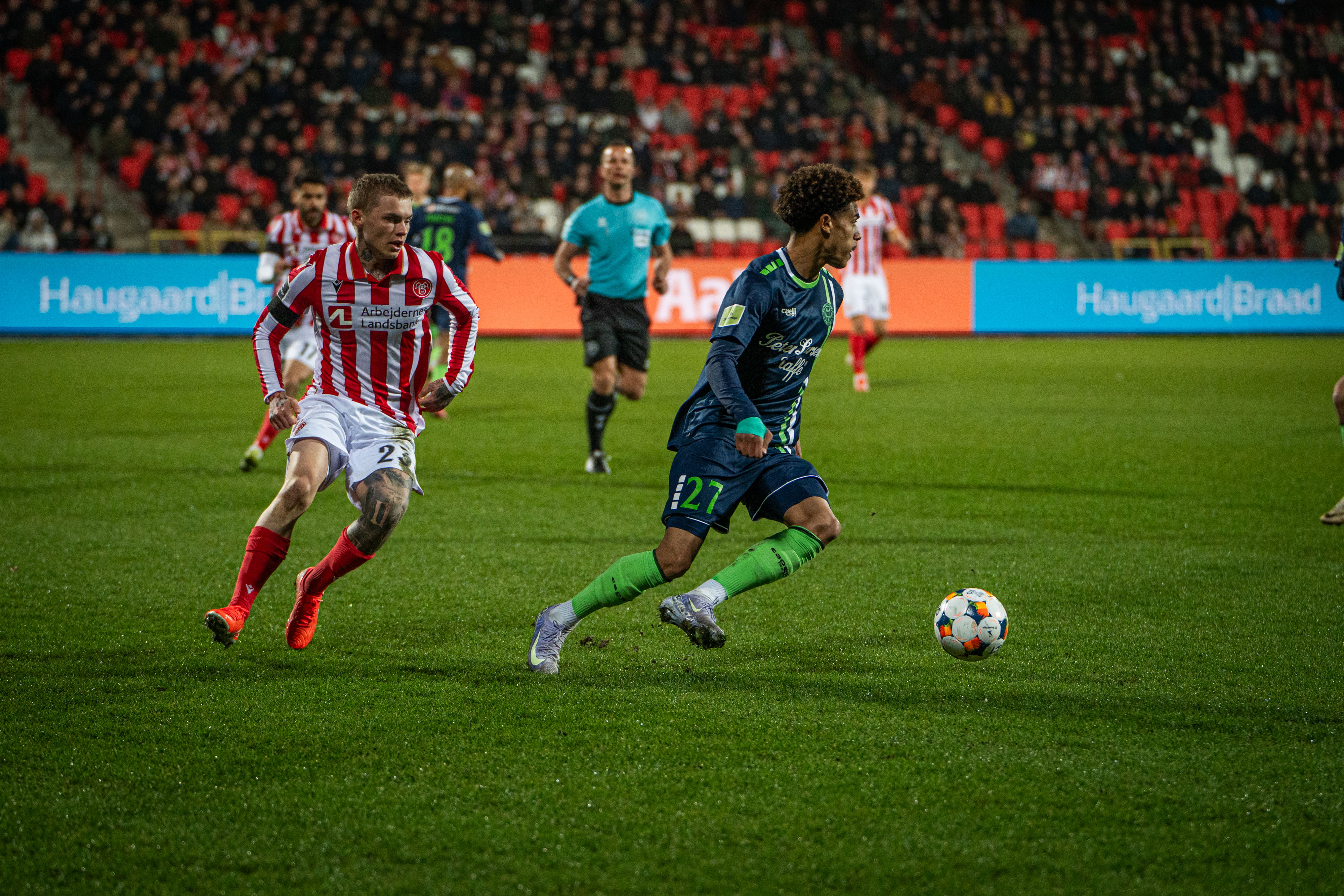 Det kom der dog ikke nævneværdige chancer ud af, og i stedet lynede VFF i modsatte ende. Renato Jr. sendte Serginho i dybden, og med først et skarp træk ind i banen og dernæst en fiks hældribling sendte portugiseren AaB´s midterforsvar ud efter pølser, inden han køligt bankede bolden i nettet.